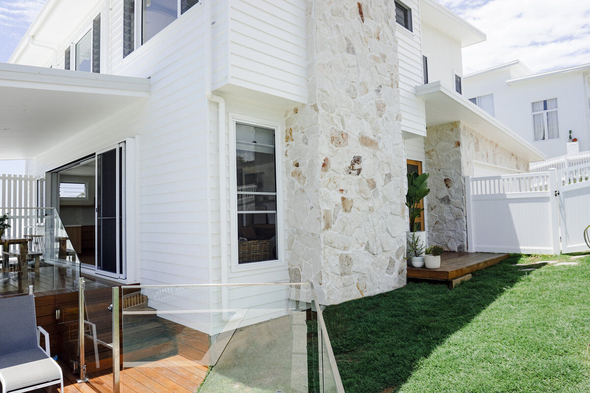 This new home with granny flat is situated on a sloping site. The main home is double story, built on bearers and joists with steel posts. This home also features a large semi in-ground pool with timber deck surround.